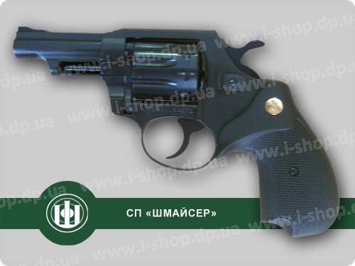 Револьвер украинского производства заводом Шмайсер. Качество сборки и обработки деталей как всегда на высоте. Ударно спусковой механизм двойного действия, а значит можно начать стрельбу самовзводом используя спусковой крючок, или предварительно взвести курок. У револьвера под патрон Флобера Шмайсер очень удобная рукоятка, она выполнена из резины с пластиком, что дает ей хорошую цепкость с ладонью. И на нижней части имеется эргономическая выемка под палец, что тоже хорошо сказывается в крепком хвате револьвера. Каморы и ствол изготовлены из стали, кстати ствол нарезной, что не мало важно для ведения точной стрельбы. Корпус оружия изготовлен из высокопрочного цинкового сплава, как и у многих других видов оружия. Длина ствола 77 мм, на нем расположена прицельная мушка. Стреляет револьвера патронами Флобера 4 мм, в барабан можно зарядить девять штук. Револьвер поставляется в комплекте с шомполом и упакован в картонную коробку.