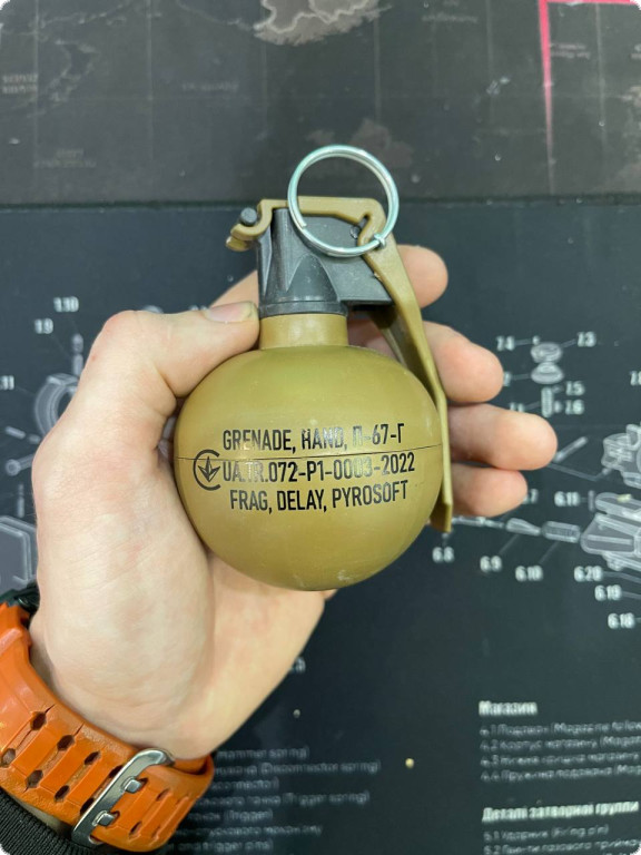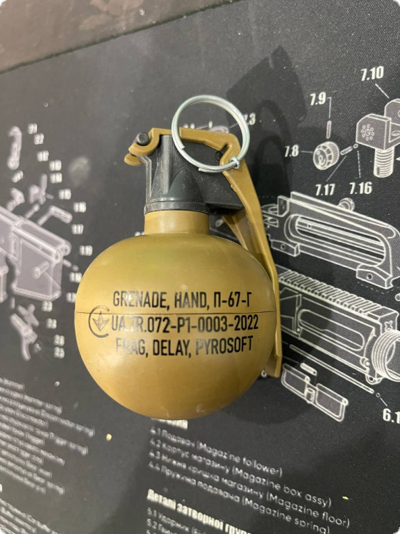Граната П-67-Г “НАТО” імітаційно-тренувальна з піротехнічним ефектом категорії Р1. Розмірами та принципом дії імітує бойову гранату M67 яка є на озброєнні США та блоку НАТО. З наповнювачем горох та парафин. Горох – імітує ураження осколками, парафін – фіксує горох у середині та усуває ефект “колотухи”. Використовується у військових тренувальних заходах, страйкбол, пейнтбол та військових реконструкціях на спеціально відведених полігонах та майданчиках поза межами громадських місць. Для безпечного отримання первинних навичок поводження та принципу дії гранати М67.