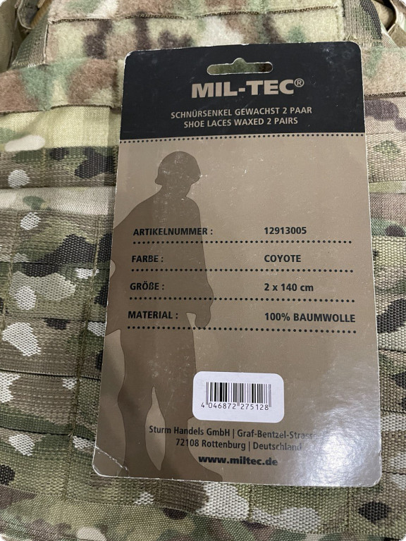 Фірмові шнурки від німецької компанії Mil-Tec, колір - койот. Довжина - 140 см. Вощіння - таке просочення дає шнуркам підвищену зносостійкість і збільшує термін служби. Добре фіксують вузли, підходять для берців від будь-яких виробників з середнім і невисоким голенищем.