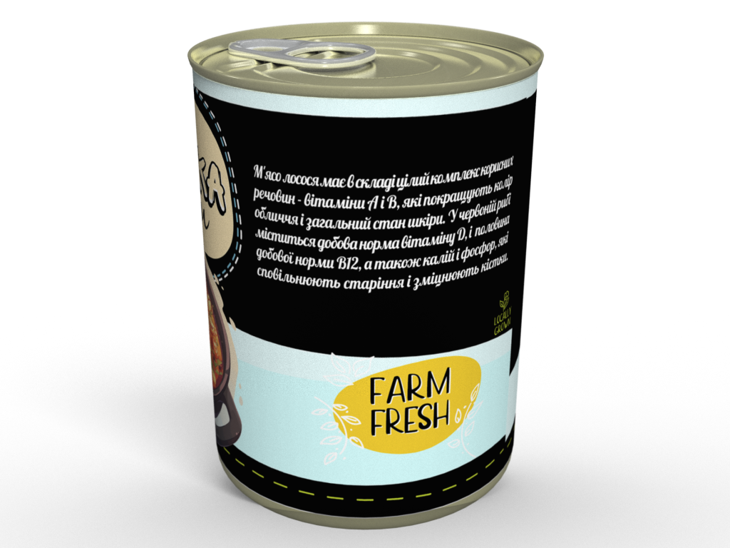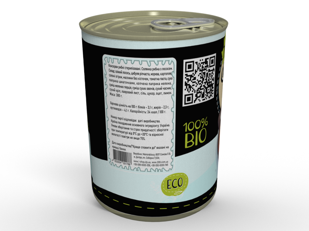 Склад: свіжий лосось, ріпчаста цибуля, морква, картопля, солоні огірки, маслини без кісточок, томатна паста, суха паприка шматочками, копчена паприка мелена, суміш мелених перців, суміш сухих овочів, сухий часник, сухий кріп, лавровий лист, сіль, цукор, оцет, лимон.
