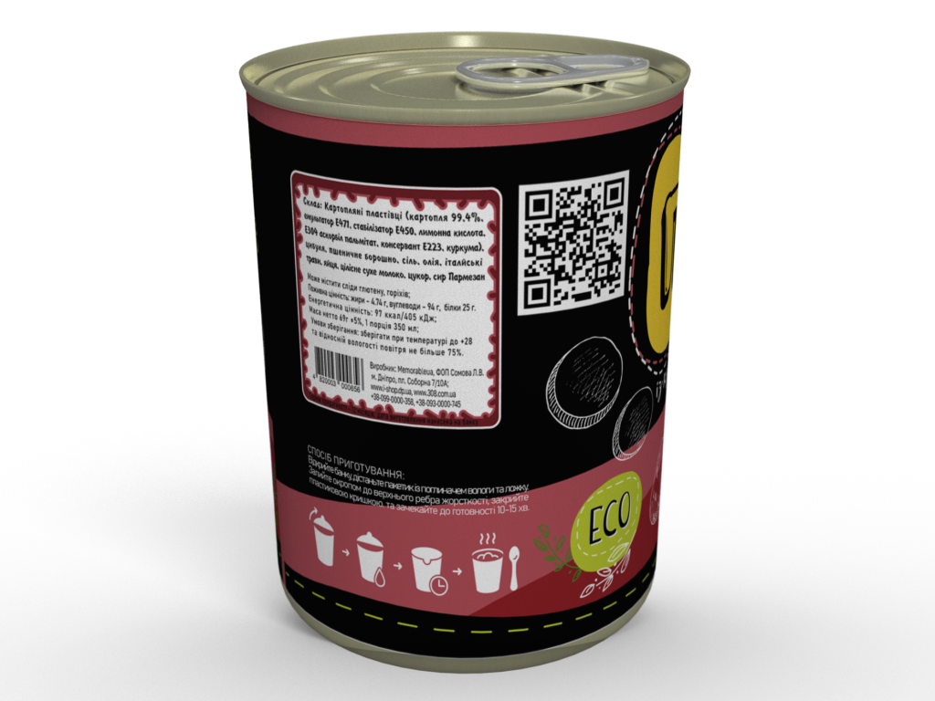 Склад: Картоплянi пластiвцi, смажена цибуля, сушена курка, яйця, цiлiсне сухе молоко, сiль, олiя, iталйськi трави, яйця, цiлiсне сухе молоко, цукор, сир Пармезан, ароматизатор iдентичний натуральному.
