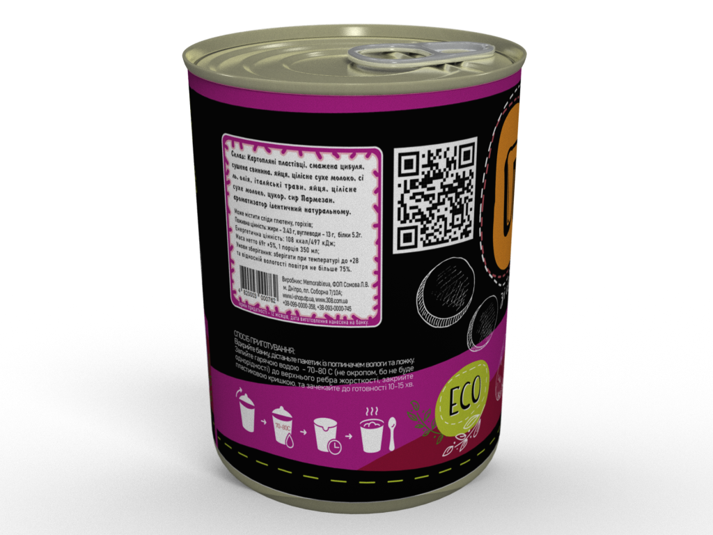 Склад: Картоплянi пластiвцi, смажена цибуля, сушена свинина, яйця, цiлiсне сухе молоко, сiль, олiя, iталйськi трави, яйця, цiлiсне сухе молоко, цукор, сир Пармезан, ароматизатор iдентичний натуральному.