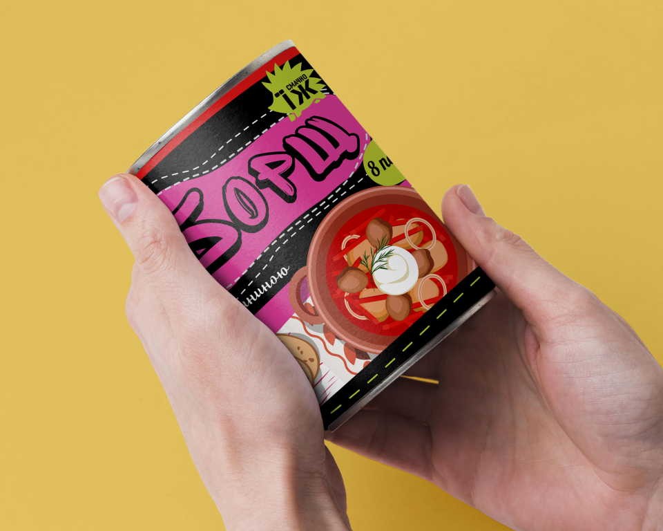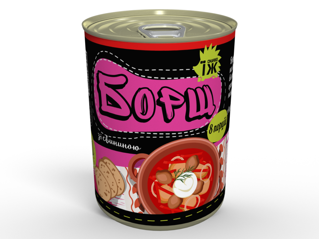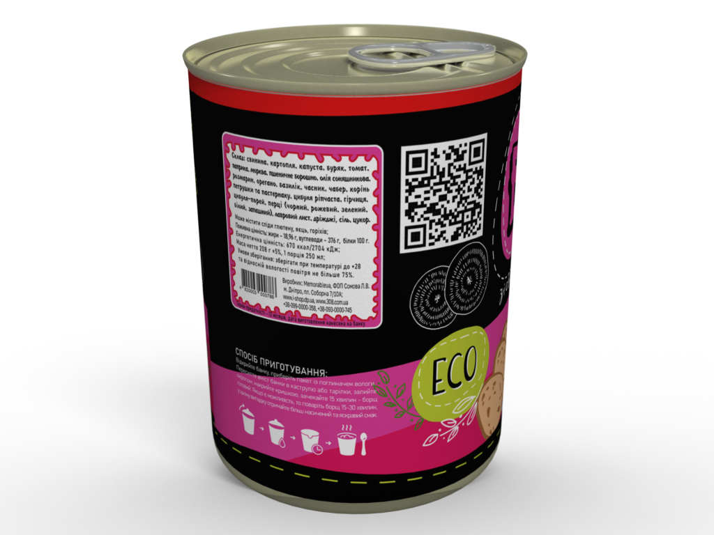 Склад: свинина, картопля, капуста, буряк, томат, паприка, морква, пшеничне борошно, олія соняшникова, розмарин, орегано, базилік, часник, чабер, корінь петрушки та пастернаку, цибуля ріпчаста, цибуля-порей, перці (чорний, рожевий, зелений, білий, запашний), лавровий лист, дріжджі, гірчиця, сіль, цукор.