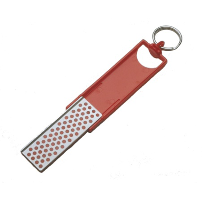 Точилка алмазная Mini-Sharp® F70F предназначена для заточки лезвий ножей в домашних и походных условиях. Точилка выполнена в виде брелока, который может быть пристегнут к связке ключей, карабину на поясе или походном рюкзаке, а скромные размеры – длина точилки не более 7 см – только способствуют удобству хранения и транспортировки. Кроме того, точилка складывается таким образом, чтобы предохранять поверхность точильного камня от повреждений – нет необходимости в специальном чехле или футляре.