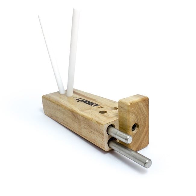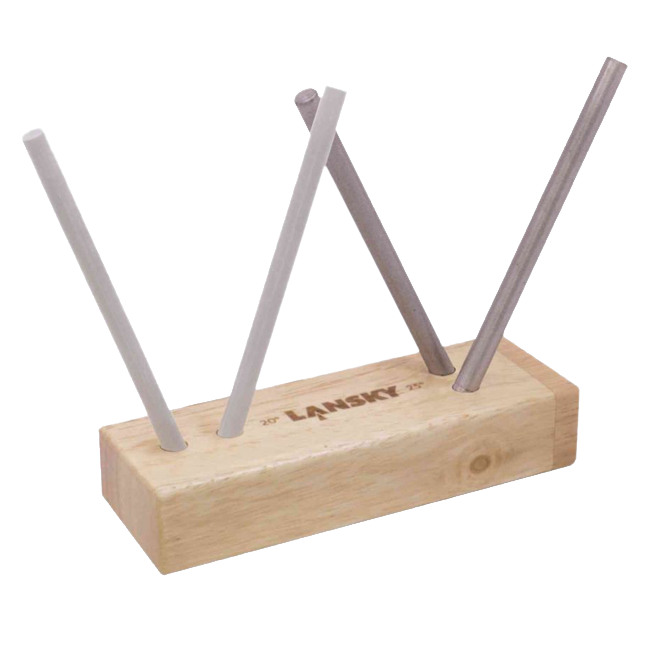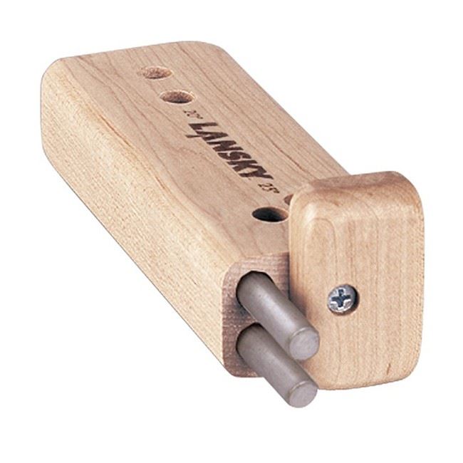 Одна или несколько пар отверстий сверлятся в деревянном бруске под различными углами относительно друг друга. После этого пара точильных камней может быть установлена в соответствующую пару отверстий – и можно осуществлять заточку! После окончания работы точильные камни могут быть убраны – брусок-основание имеет отсек для хранения точильных камней.