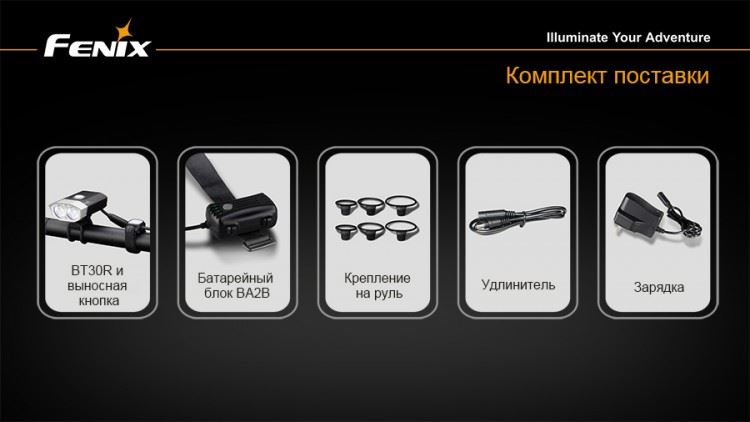 Fenix BT30R подходит для закрепления на велосипедных рулях разного диаметра. Для этого в комплекте предусмотрено несколько резиновых колец-креплений разного размера. Они легко крепятся и так же легко снимаются, когда возникает такая необходимость. Чтобы велосипедист в любой момент мог воспользоваться максимальной яркостью турборежима, на руль крепится кнопка моментального доступа к свету.