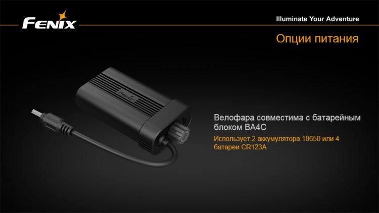 Велофара Fenix BT30R получает питание от внешнего аккумуляторного блока, разработанного специально для этой модели. Емкость этого блока составляет 2600 мАч, а пополнить заряд можно при помощи, зарядки, которая входит в стандартный комплект поставки. Помимо того, можно подсоединить обыкновенный аккумуляторный блок, вмещающий 2 батареи размера 18650, который потребуется докупать отдельно.