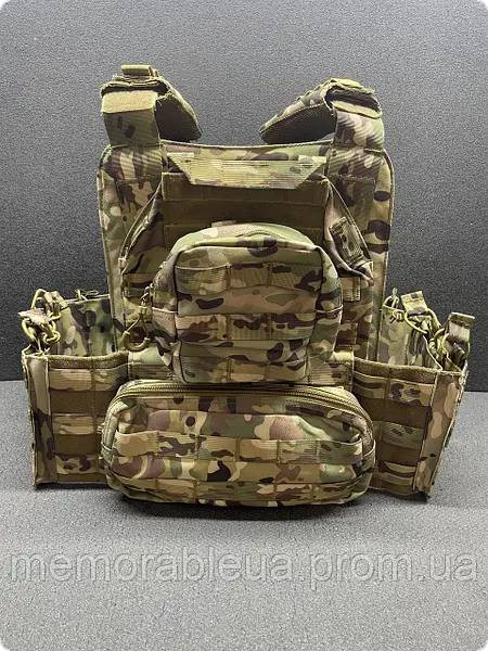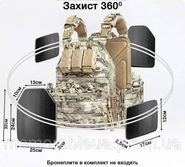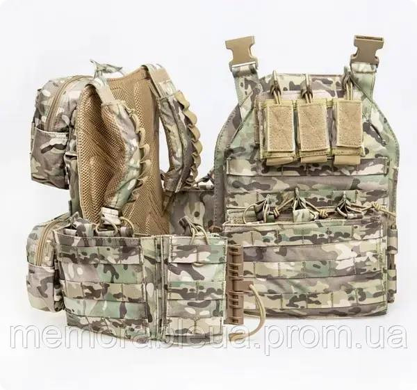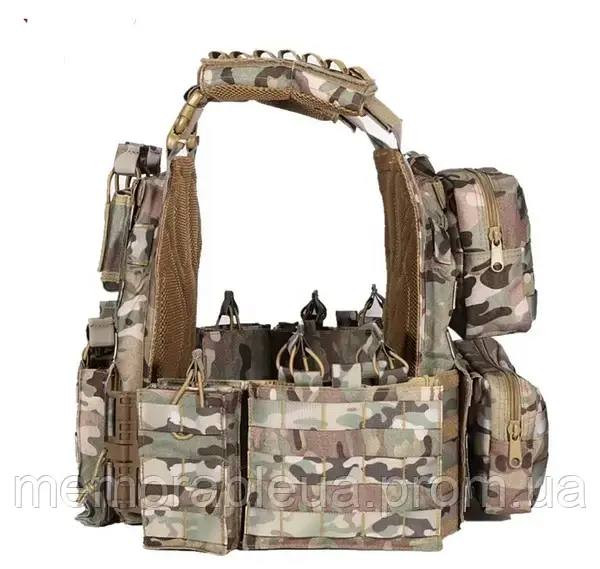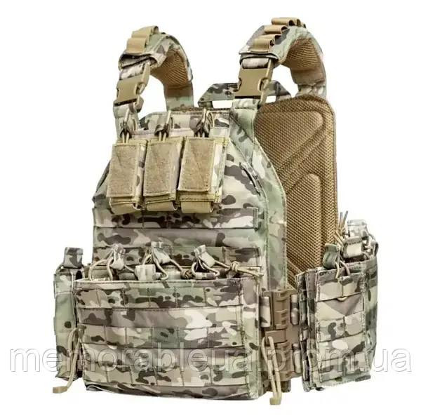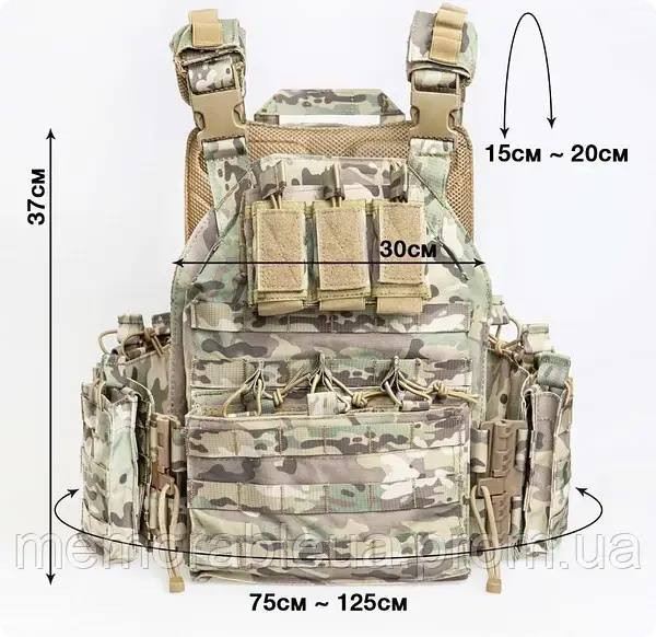 Матеріал: Нейлон 1000D Система MOLLE по всій поверхні жилета, підсумки під автоматні магазини 9 шт з системою MOLLE, дві сумки під інше приладдя з системою MOLLE, під три підйомні магазини з велкро панелями. Боковини пояса жилета з прихованими кишенями під доп.захист. Особливості: - Подвійна стінка жилета, під бронеплиту та під додаткову демпферну вставку. - Чохол для бронежилета, призначений для перенесення бронеплит стандартних розмірів 25*30см, спереду та ззаду. - Передня панель обладнана підсумком під три ріжки АК. - Бічні підсумки із системою MOLLE 6 шт. під ріжки, рацію та інше обладнання. - Задні підсумки із системою MOLLE 2 шт. під аптечку або інші аксесуари. - Передня та задня сторони жилета оснащені системою MOLLE, що збагачує розширення обладнання. - На передній та задній частинах чохла розміщені велкро панелі для патчів. - По всій площі жилет обшитий стропами системою MOLLE, що дає можливість переносити, у зручному положенні підсумки та спорядження. - Внутрішні кишені для твердих бронепанелей. - Регулюється по обхвату та висоті. - Знімний пояс. - Швидкознімний пояс та плечові ремені жилета. - Так само плечові ремені обладнані додатковими чохлами для комфорту носіння жилета із системою MOLLE. - Грудна частина жилета та cпина обладнані демпферною дихаючою сітчастою тканиною. - Наявність фірмового упакування та бірок бренду Yakeda.